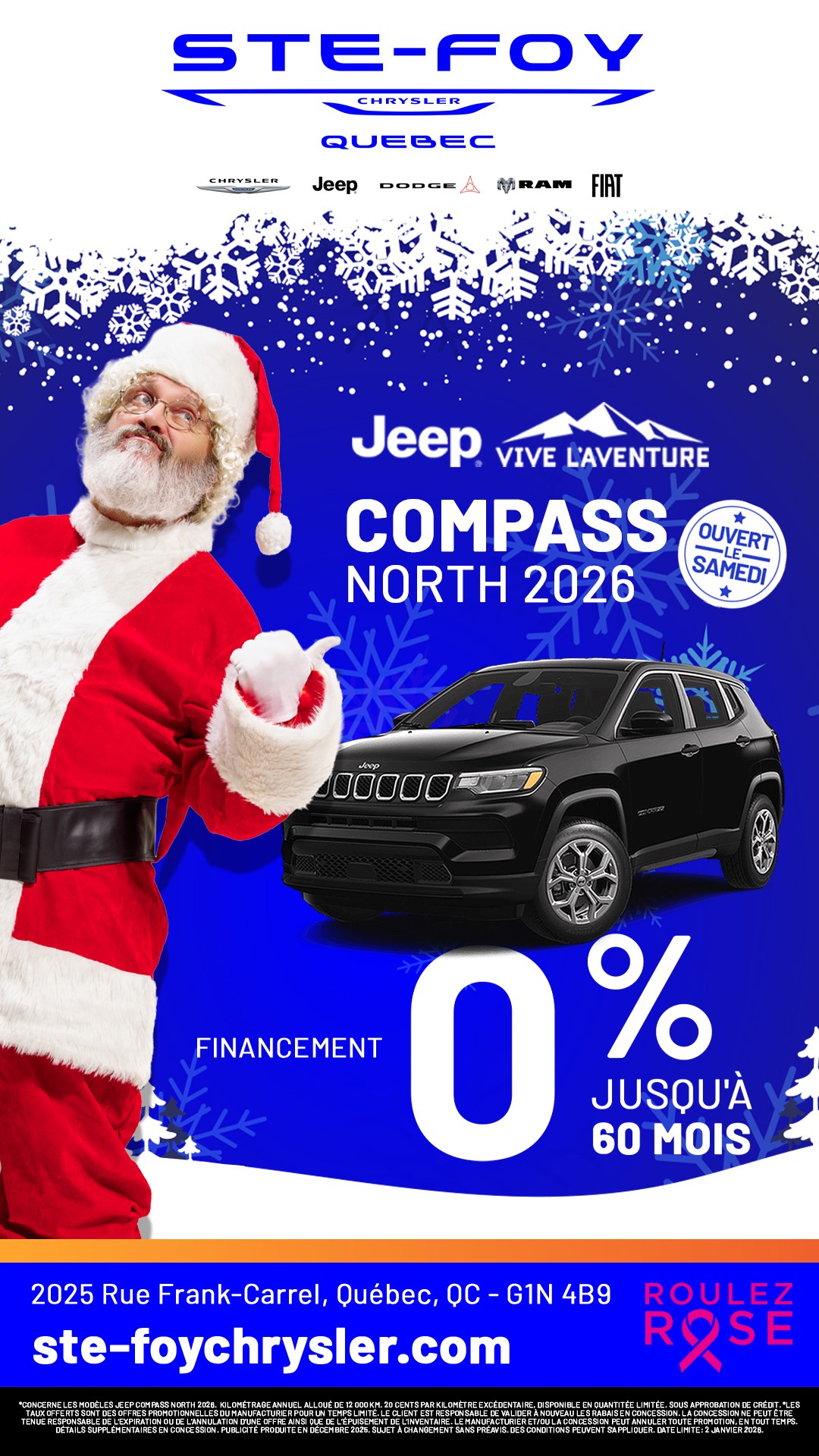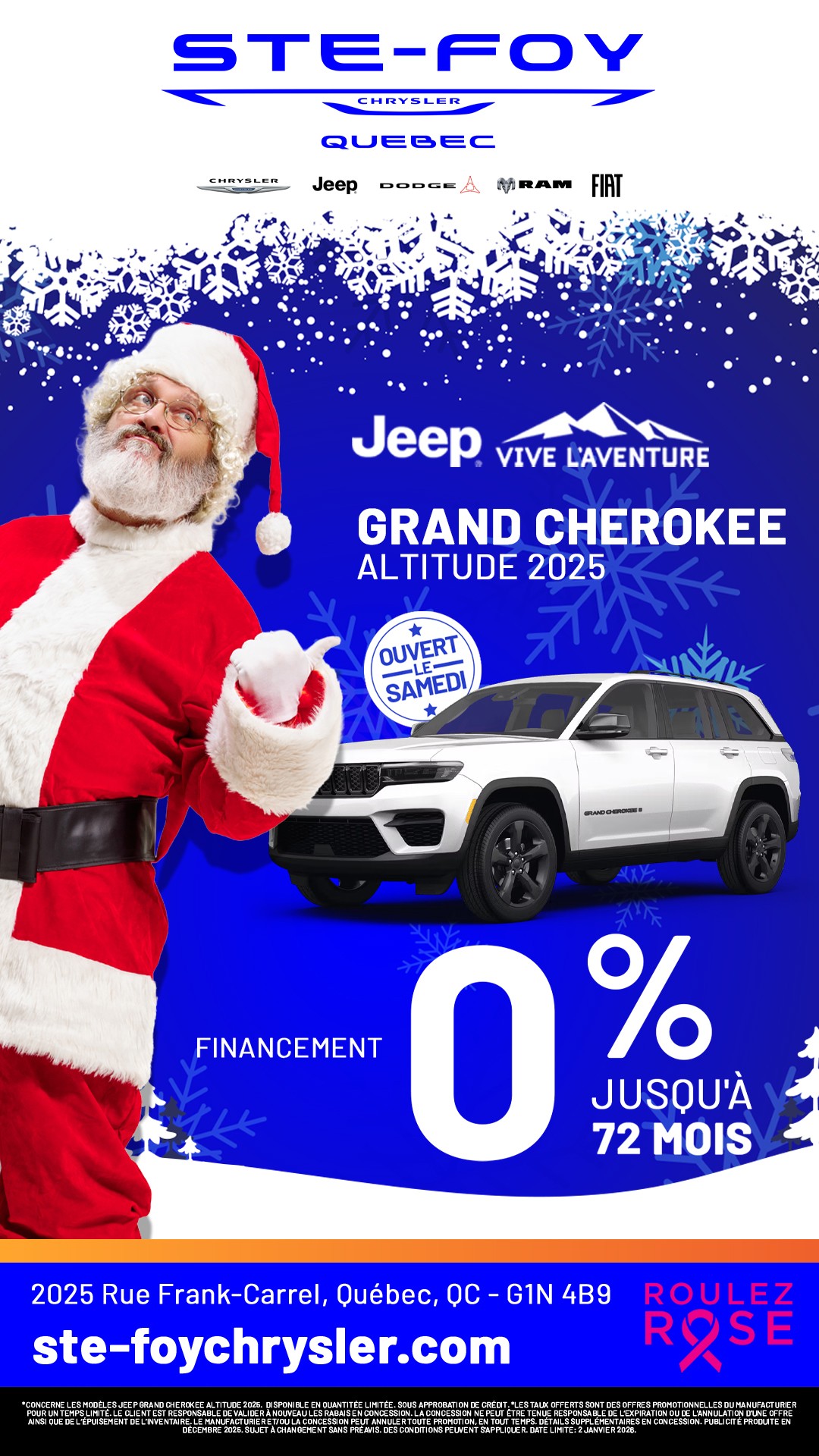 Bienvenue sur le site officiel de Ste-Foy Chrysler, le premier choix pour les véhicules de qualité de marques réputées comme Jeep, Chrysler, Dodge, Fiat et RAM à Québec. Notre passion est de vous offrir une expérience automobile incomparable, alliant la diversité de nos modèles à un service clientèle exceptionnel.