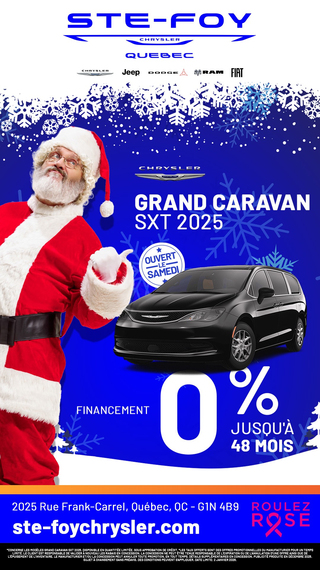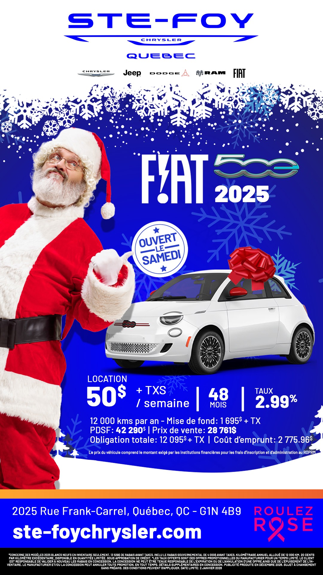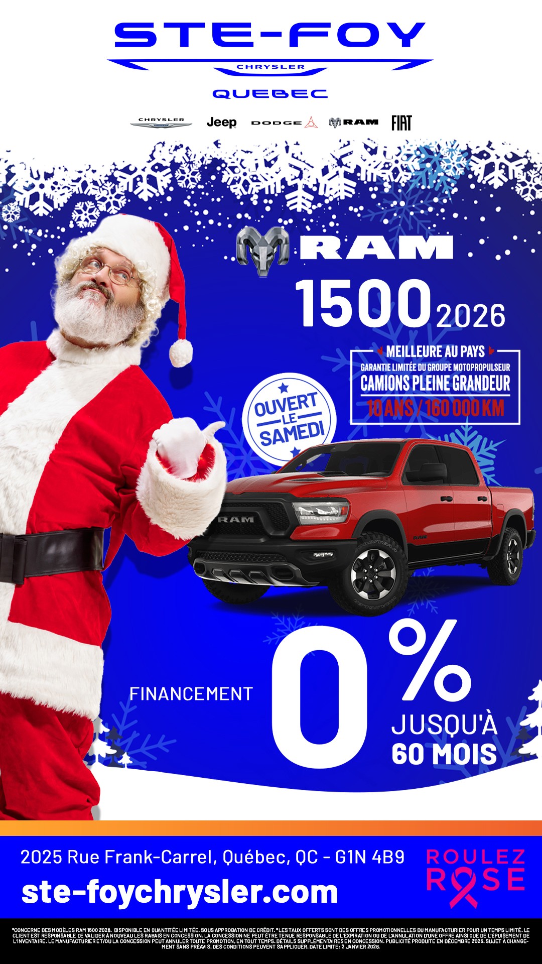 Vous pouvez avoir la certitude que chaque voiture que nous proposons est conçue pour offrir une expérience de conduite incomparable. Chez Ste-Foy Chrysler à Ste-Foy, nous mettons l'accent sur la qualité, et cela se reflète dans chaque véhicule que nous vendons. Nous sommes déterminés à vous proposer les meilleurs prix possibles pour les véhicules Chrysler, Jeep, RAM, Dodge et Fiat de haute qualité que nous offrons. Grâce à nos offres spéciales et à notre engagement envers la satisfaction de nos clients, nous vous garantissons une excellente valeur pour votre argent. Alors, si vous recherchez la quintessence des véhicules Chrysler, Jeep, RAM, Dodge et Fiat à Québec, venez nous rendre visite aujourd'hui. Découvrez notre sélection de voitures exceptionnelles qui incarnent la qualité, la performance et l'élégance. Chez Ste-Foy Chrysler, votre quête de l'excellence automobile commence ici. À la recherche d'offres imbattables sur les véhicules Chrysler, Jeep, RAM, Dodge et Fiat? Ne cherchez pas plus loin! Chez Ste-Foy Chrysler, nous sommes fiers de vous proposer des promotions exceptionnelles sur toute la gamme de véhicules Chrysler, Jeep, RAM, Dodge et Fiat. Que vous soyez intéressé par une berline élégante, un puissant camion 4x4, un VUS spacieux ou un véhicule utilitaire robuste, nos offres spéciales sont conçues pour vous offrir un rapport qualité-prix inégalé. Nos promotions en cours vous permettent d'économiser gros sur l'achat d'un véhicule Chrysler, Jeep, RAM, Dodge et Fiat neuf ou d'occasion. Profitez de rabais exceptionnels, de taux de financement avantageux et d'incitatifs uniques qui rendent l'acquisition de votre véhicule Chrysler, Jeep, RAM, Dodge et Fiatencore plus attrayante. Notre équipe dévouée est là pour vous guider à travers toutes les promotions disponibles, afin de vous assurer de tirer le meilleur parti de votre investissement automobile. Que vous soyez un passionné de la performance, de la technologie, de la sécurité ou du style, les véhicules Chrysler, Jeep, RAM, Dodge et Fiat offrent une gamme diversifiée de modèles qui répondront à toutes vos attentes. Ne manquez pas l'opportunité de posséder un véhicule Stellantis de qualité supérieure tout en profitant d'offres exceptionnelles. Visitez-nous dès aujourd'hui chez Ste-Foy Chrysler pour découvrir nos promotions en cours et pour faire l'essai de ces incroyables véhicules Stellantis. Ne laissez pas passer cette occasion de conduire avec style, performance et fiabilité, le tout à des prix avantageux. Chez nous, vous êtes sûr de trouver la meilleure offre sur votre prochain véhicule Chrysler, Jeep, RAM, Dodge et Fiat. Rendez-vous chez Ste-Foy Chrysler et économisez gros sur votre achat automobile!