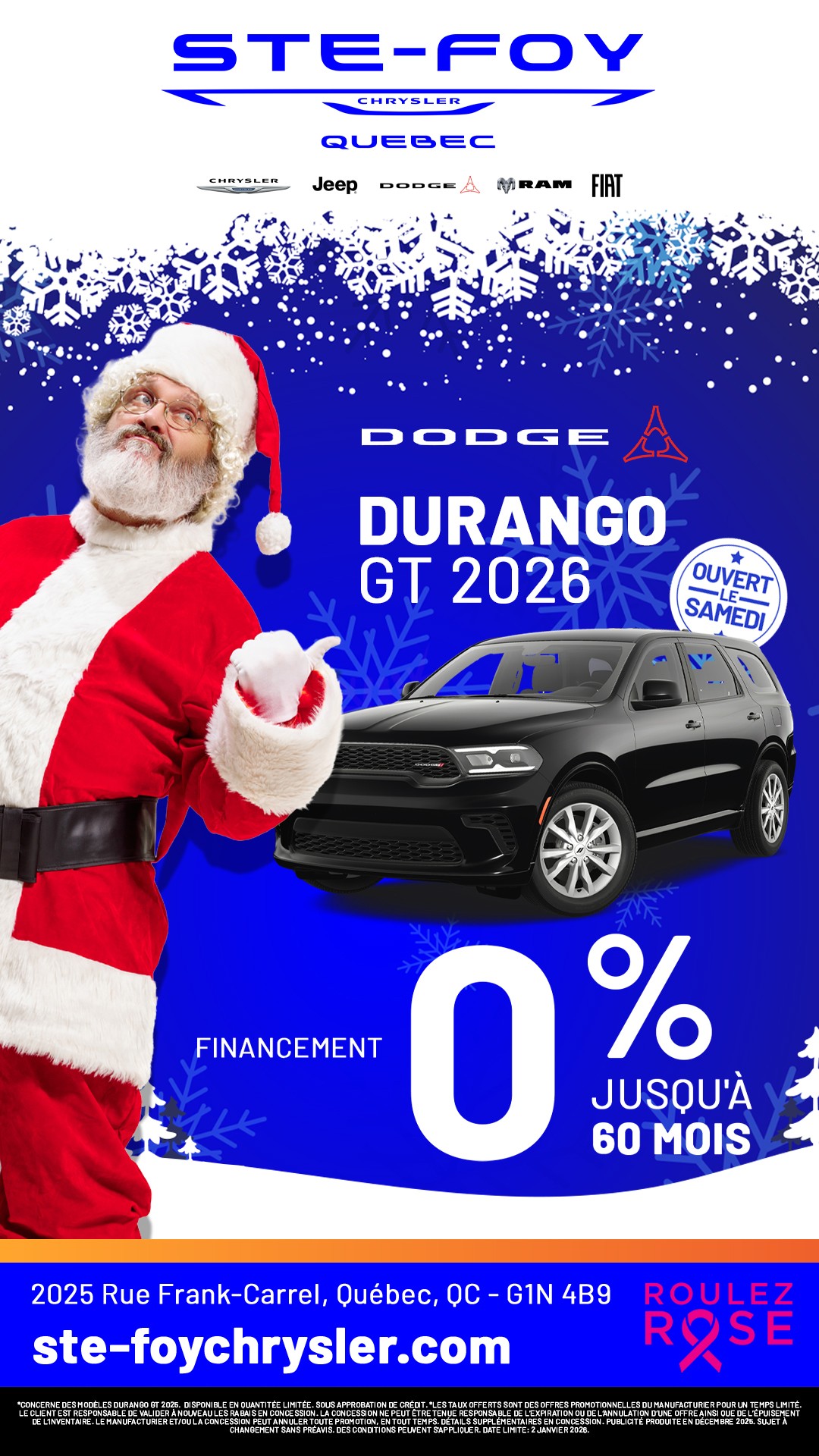 Bienvenue sur le site officiel de Ste-Foy Chrysler, le premier choix pour les véhicules de qualité de marques réputées comme Jeep, Chrysler, Dodge, Fiat et RAM à Québec. Notre passion est de vous offrir une expérience automobile incomparable, alliant la diversité de nos modèles à un service clientèle exceptionnel.